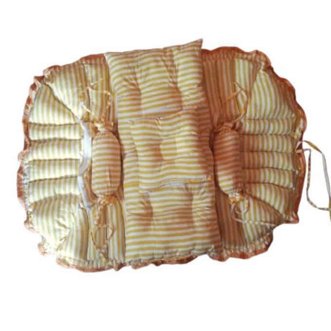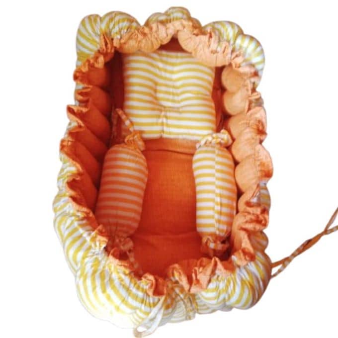 The Nest&Nap Baby Bed is designed to keep your little one snug and supported anytime, anywhere. With its soft cotton inner lining, burnt orange drawstring border, and cheerful yellow and white striped interior, it creates a soothing environment for restful sleep and calm playtime.